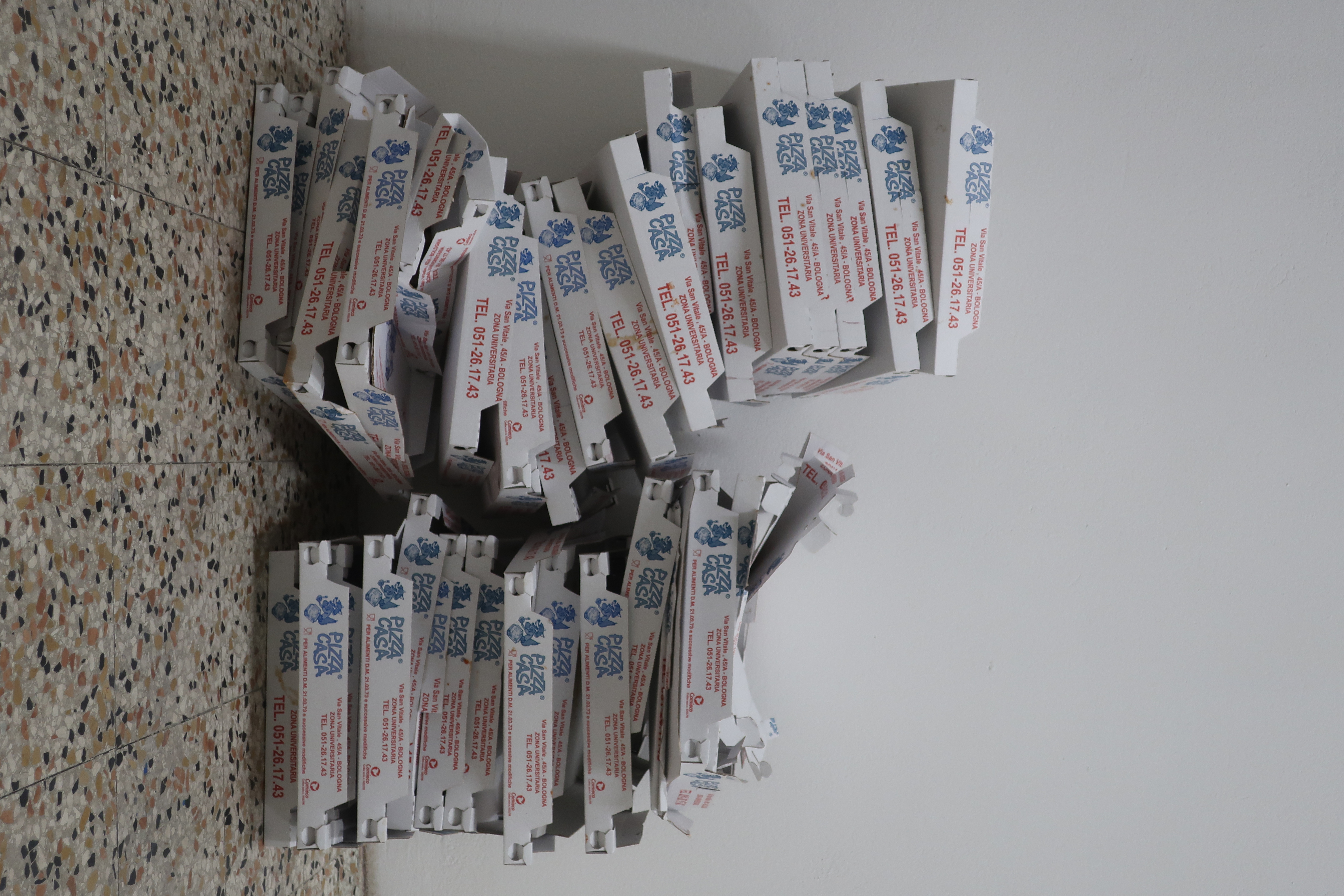 A week long performance honouring iconic Pizza Casa pizza-place in Bologna, during which the artist lived in a house built out of pizza cardboard in the gallery space while only feeding by eating Pizza Casa’s pizza.